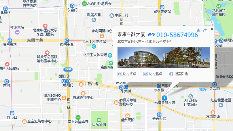 泰康金融大厦http://www.bjtaikangjinrong.cn,位于京广桥东北角,紧邻东三环,大厦高150米,地上38层,地下3层,恢宏的气度、卓越超凡的国际品质以及唯美典雅的艺术氛围,使其成为CBD又一道亮丽的风景。大厦内设艺术主题的高档商务会所,世界顶级红酒廊、高端餐厅、艺术活动空间、雪茄吧,中西合璧,独一无二。大厦周边商务氛围浓郁,中国大饭店、香港文华酒店、柏悦酒店、雅诗阁公寓、嘉里公寓、京广酒店、丽兹卡尔顿酒店、万豪酒店、国贸商城、世贸天阶。